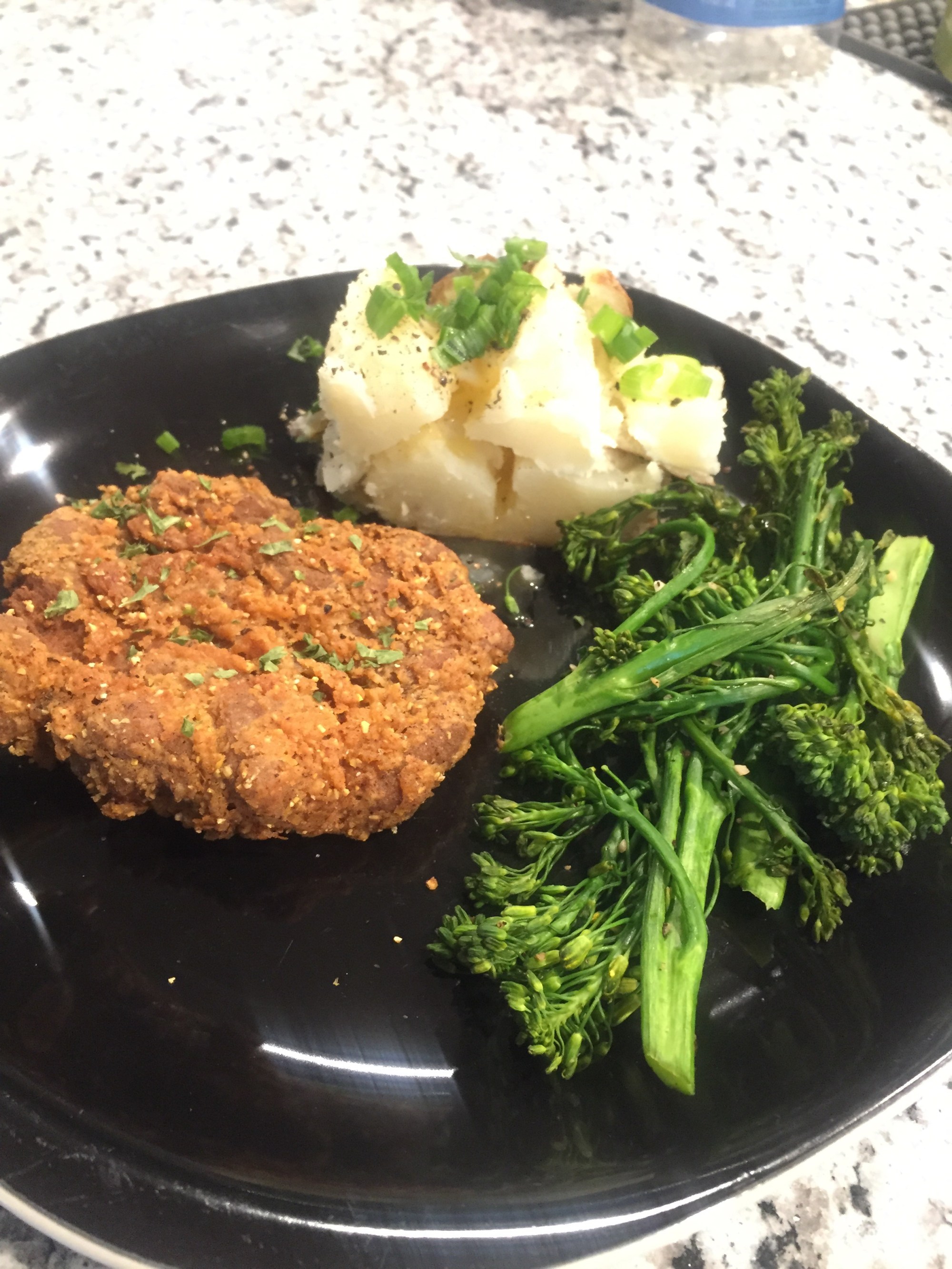 Finally, sprinkle with a little parsley to make it look all fancy and enjoy with your favorite sides, or on a sandwich, or by itself. We had some oil-free sauteed garlic brocolini and baked potatoes! I would recommend adding some more Crystal’s hot sauce on top of the chikn for good measure. Enjoy!