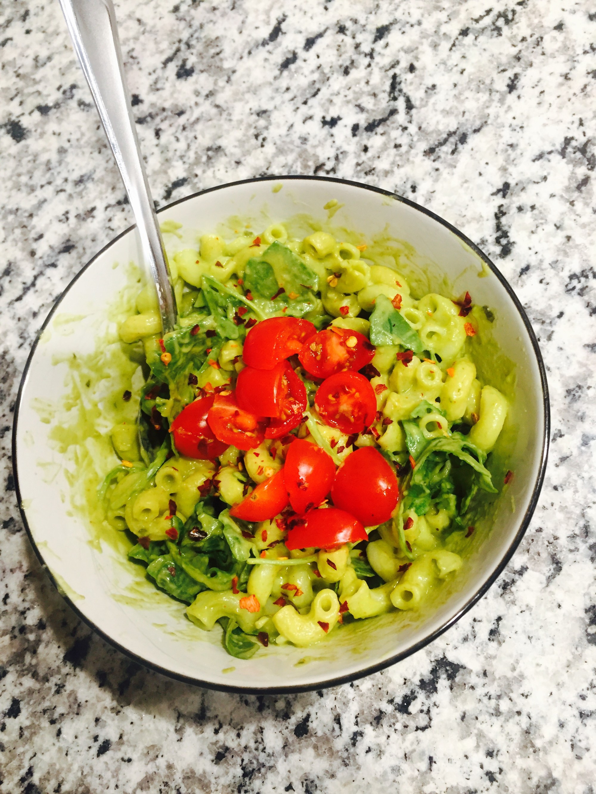 Grab some arugula and throw it in your macaroni mix. The peppery flavor and greeny texture adds a whole other element. We also added some chopped up cherry tomatoes and red pepper flakes.